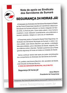 Campanha - Desde 15 de agosto, o Sindicato de Sumaré está com a Campanha Saúde Pede Segurança. A iniciativa teve início no final de julho, quando cinco homens invadiram o Centro Integrado de Saúde (CIS) de Nova Veneza e balearam uma enfermeira covardemente e levaram celulares, relógios e o carro de um trabalhador.