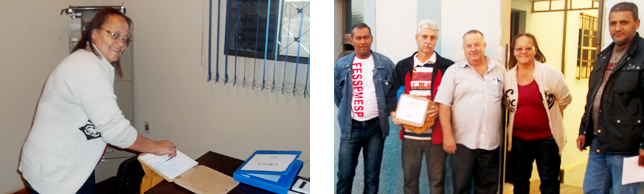 | Presidenta do Sindicato de Guariba, Joanice de Souza, durante voto; ao lado, Ted com dirigentes da entidade |