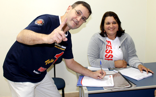 | Toninho Forti, encabeçador da Chapa 1 e vice-presidente do SSPMANO, assina lista antes de votar |