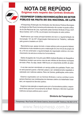 A Fesspmesp (Federação dos Sindicatos dos Servidores Públicos Municipais do Estado de São Paulo) lamenta profundamente não constar na pauta unificada do Dia Nacional de Luta, organizado pelas Centrais Sindicais (Força, CUT, Nova Central, UGT e CTB), as principais reivindicações do setor público.