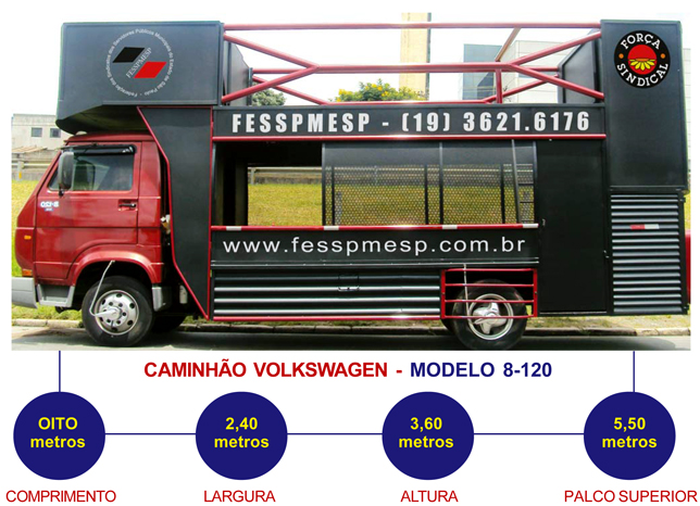 Para ampliar o alcance de atuação da Fesspmesp e fortalecer ainda mais as ações em prol do Servidor, em julho, compramos um caminhão Volkswagen modelo 8- 120, última geração, equipado com som profissional. No movimento sindical, o veículo é mais conhecido como trio elétrico.