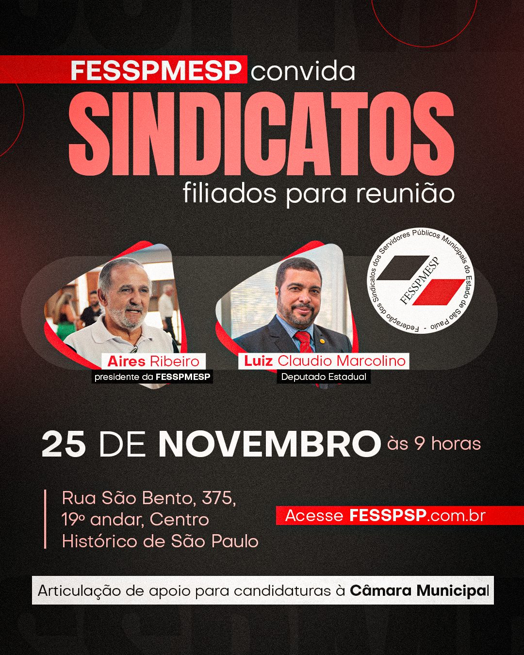 A Fesspmesp convoca todos os seus Sindicatos filiados, dirigentes e, especialmente, aqueles com atuação ou aspiração ao Legislativo municipal para um importante encontro. Será na próxima terça, 25 de novembro, às 9 horas na rua São Bento, 375, 19º andar, Centro Histórico de São Paulo. O objetivo central é alinhar estratégias para as próximas eleições e fortalecer a capacidade de nossos representantes em destinar emendas orçamentárias que beneficiem os municípios e, por consequência, a categoria. O evento contará com a presença ilustre do Deputado Estadual Luiz Claudio Marcolino, um aliado de peso da categoria.